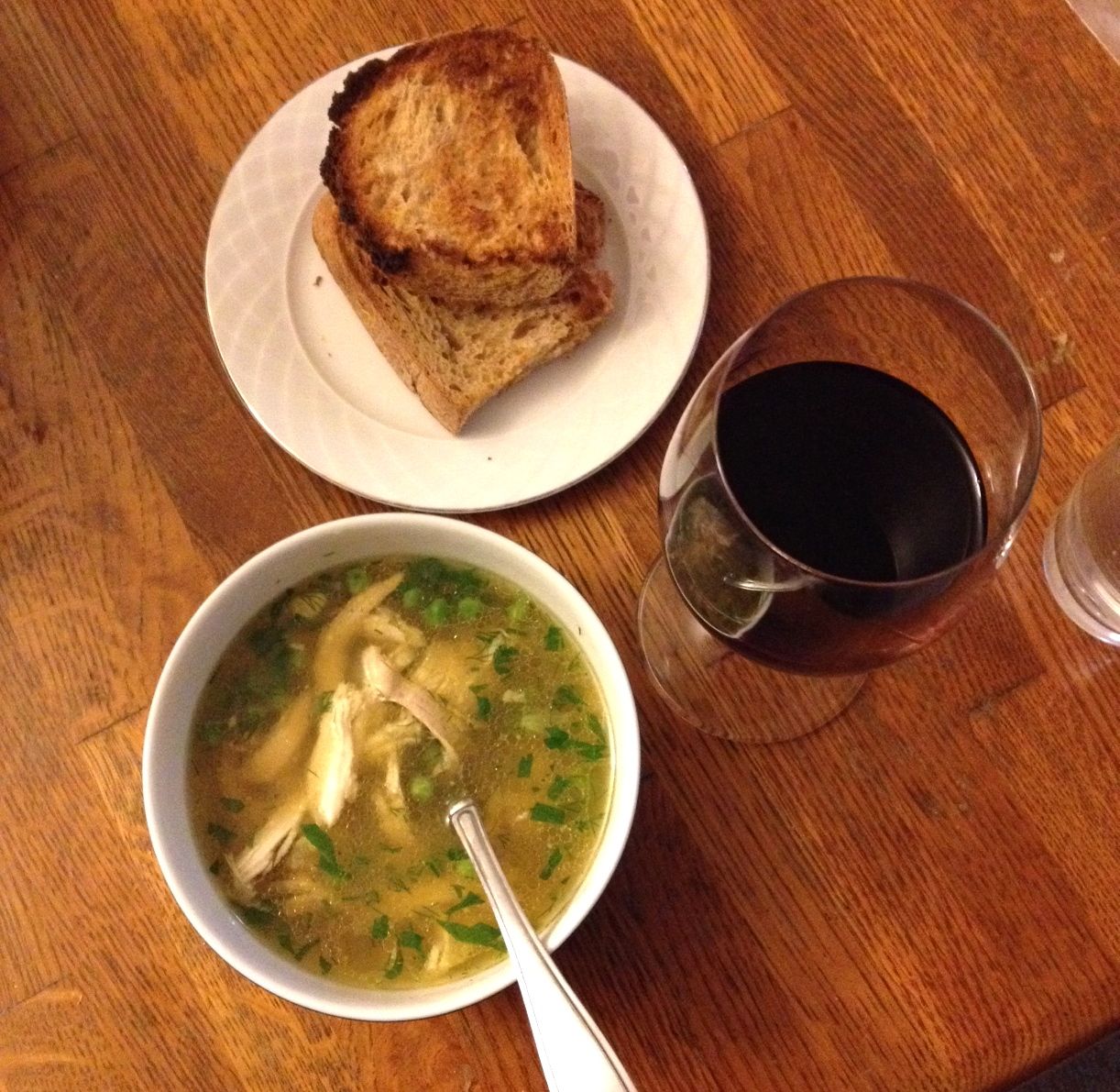On this particular evening, I added frozen corn and peas to the stock, some of the shredded breast meat from the chicken, fresh chopped parsley and dill, and served it to my sick husband with toasted crusty bread on the side for dunking. Based on his health the next day, I’m still convinced chicken soup has special powers.