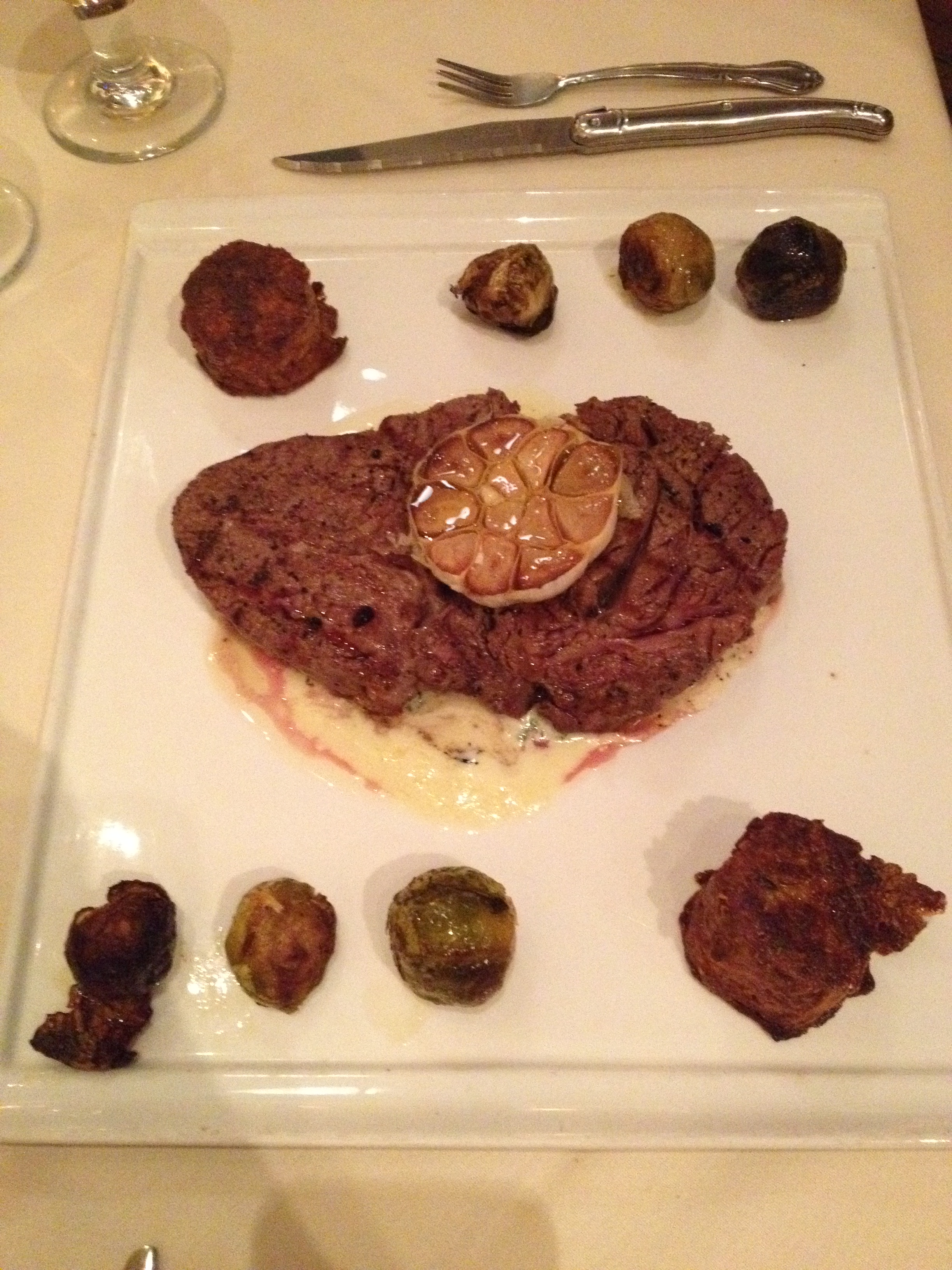 For our main courses, J had the ribeye with gorgonzola creamed spinach, Brussels sprouts, and “tater tot” stacks (bigger versions of tater tots). Did I forget to mention half a head of roasted garlic? Oh yeah, that was amazing. I stole some cloves for my dish as well.