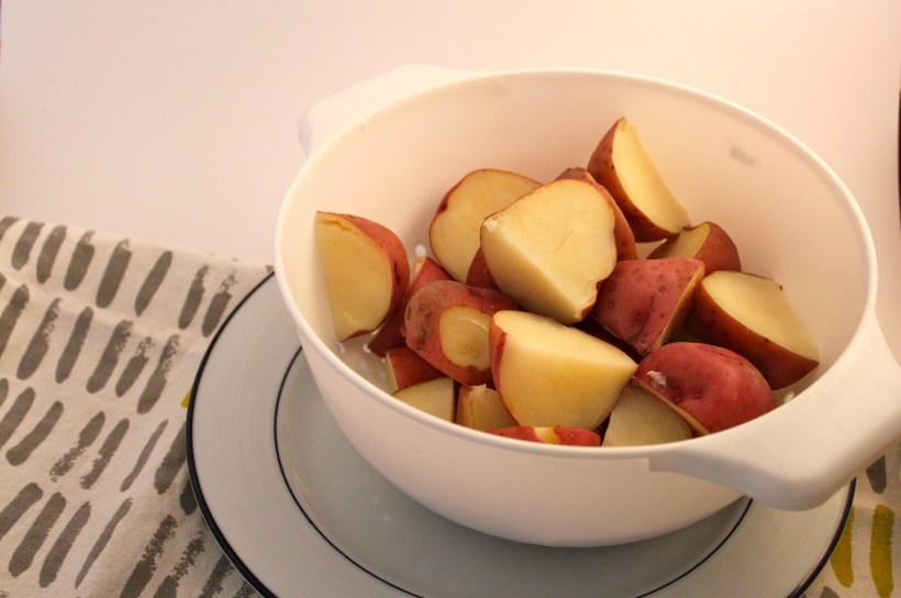 Place washed and quartered potatoes in a large pot with cold salted water. Bring to a boil, then reduce to a simmer and cook for 15 minutes. Cook until fork tender. Drain potatoes and leave colander in the sink or place on a plate on the counter, cover potatoes with a clean kitchen towel and let cool.