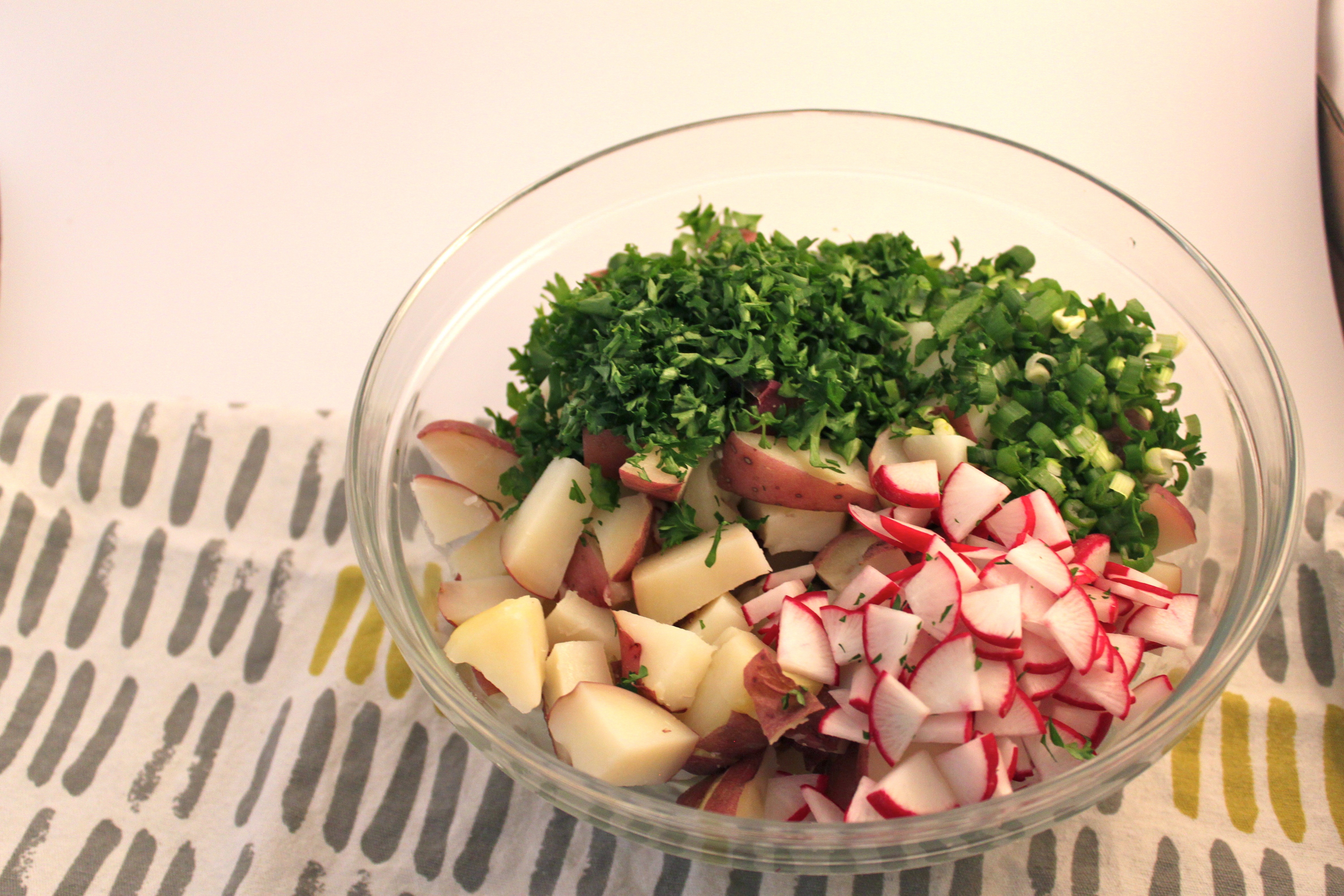 Once potatoes are cool enough to handle but still warm, cut into smaller bite sized pieces and place in a large bowl. Add veggies and dressing to the bowl with the potatoes and stir to combine. Taste and season with more salt and pepper if needed.