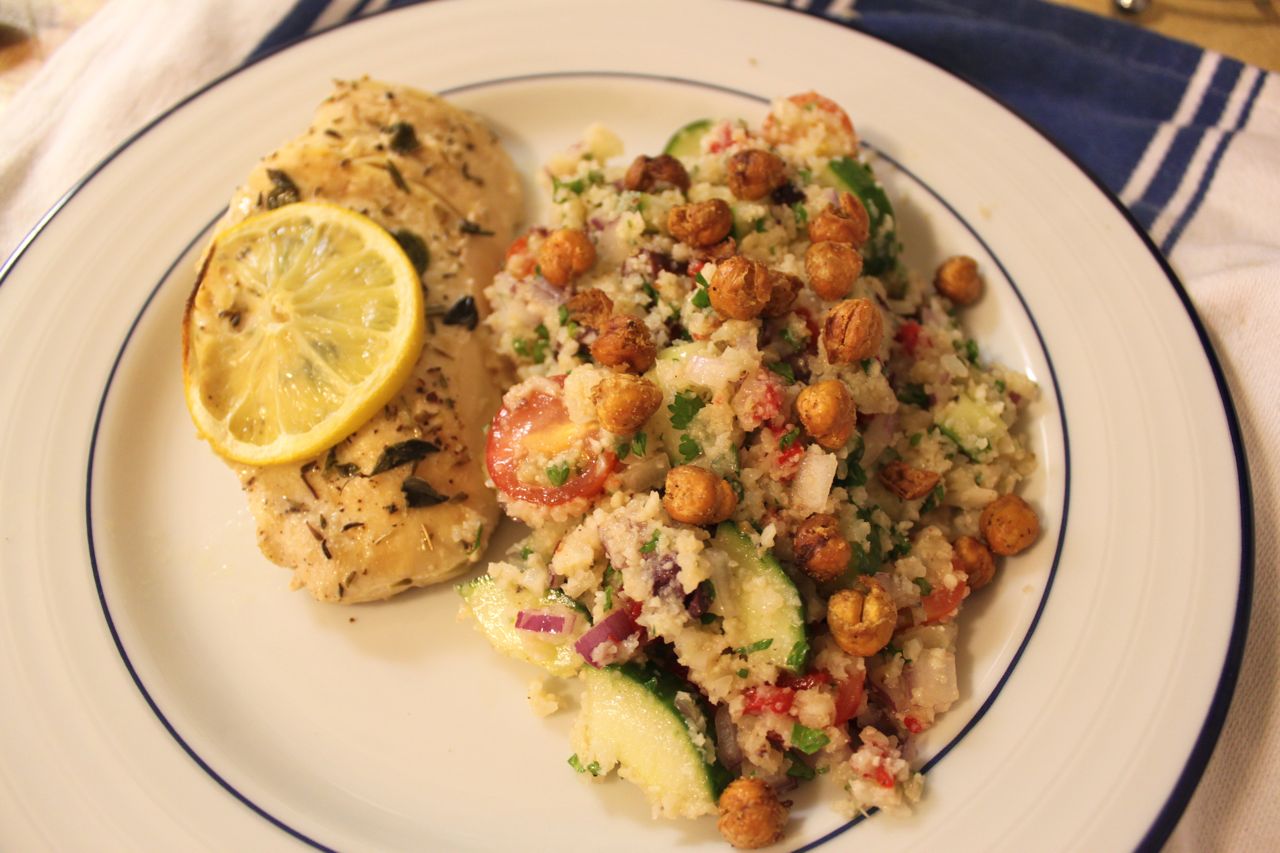 Over the past few months, I have seen cauliflower couscous pop up here and there on different food blogs I follow. I always kind of shook my head thinking “cauliflower can’t replace couscous, I mean, how can a veggie taste like a pasta!?” Then I made it last week. Like the saying goes, don’t knock it til you try it. It was SO GOOD. Totally hit the spot. I served it along side some lemony herb roasted chicken. Perfect spring dinner.