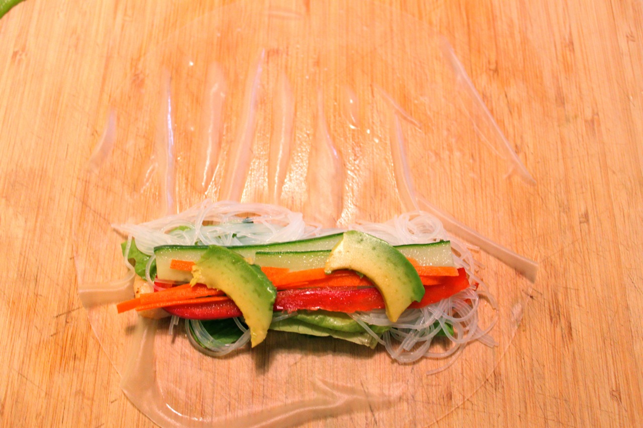 It is important to have all of the components of the spring rolls ready before you assemble. J and I tend to set everything out on the table in an assembly line, make one fresh roll and eat it immediately. We make and eat as we go. You could try and assemble them all first and then eat them. If you are successful with this, I applaud you.