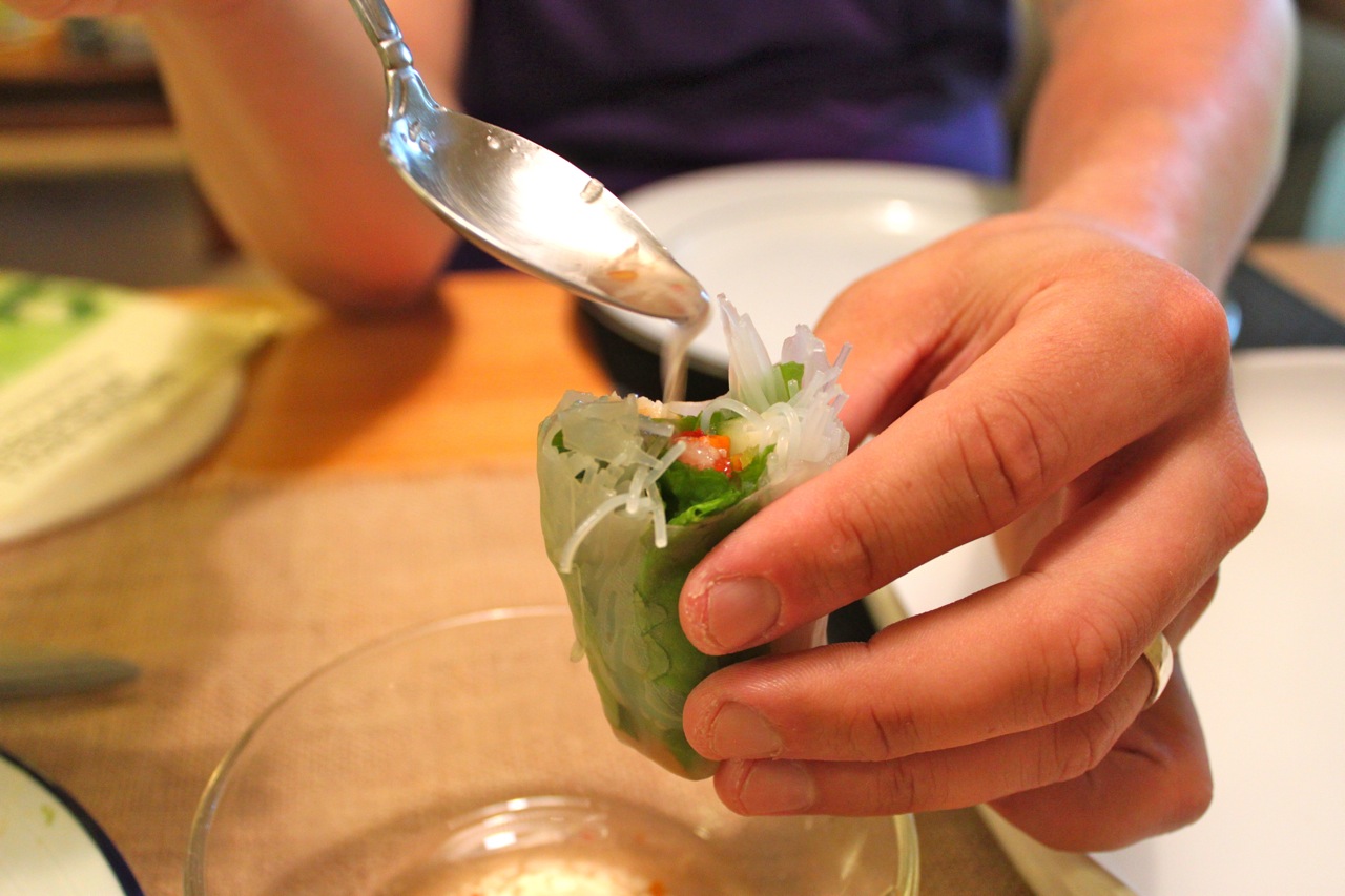 After you bite into the end, you can pour the sauce into the fresh roll to avoid the filling falling out when you try and dip it in the bowl upside down.