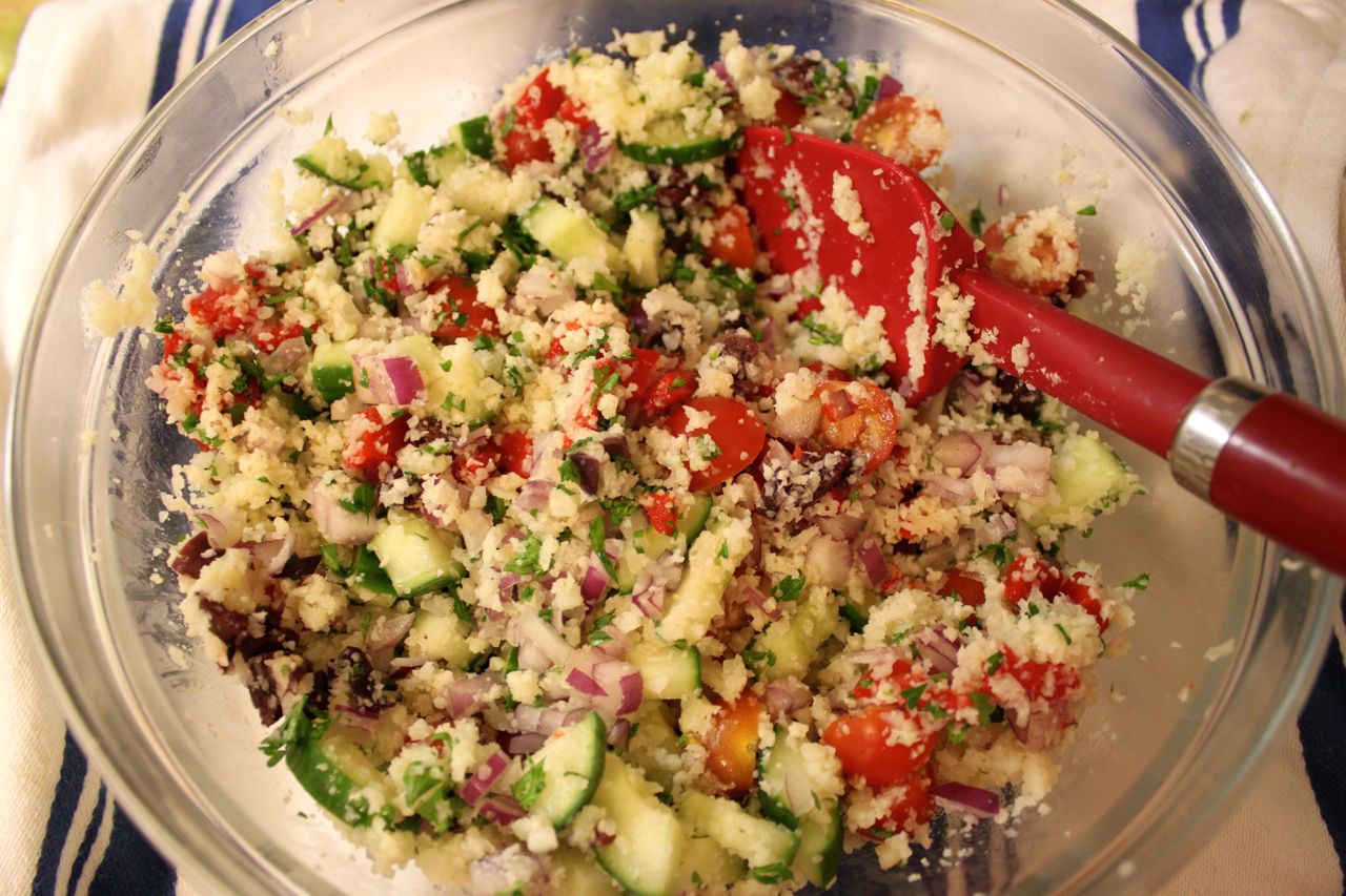 And ends up like this! Cauliflower resembles couscous more in texture than in flavor. However, adding a delicious dressing will make both regular couscous and the cauliflower version sing. I recommend you pick up a head of cauliflower and make this recipe ASAP.
