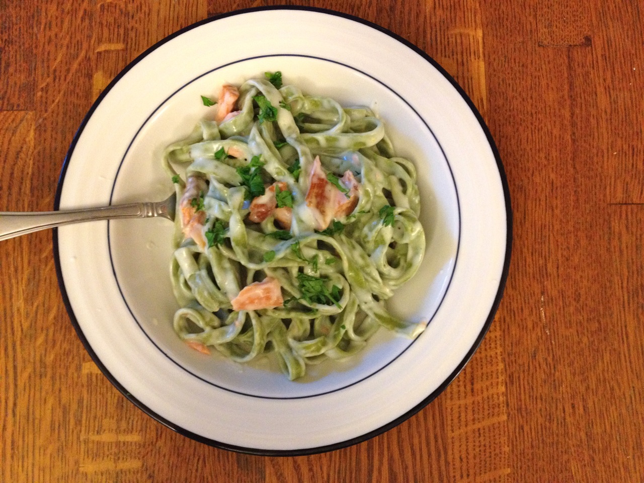 The result of working at the market is that sometimes I impulse shop at the market for dinner! The result one night was spinach pasta with Alaskan smoked salmon, cream sauce, parsley, and lemon.